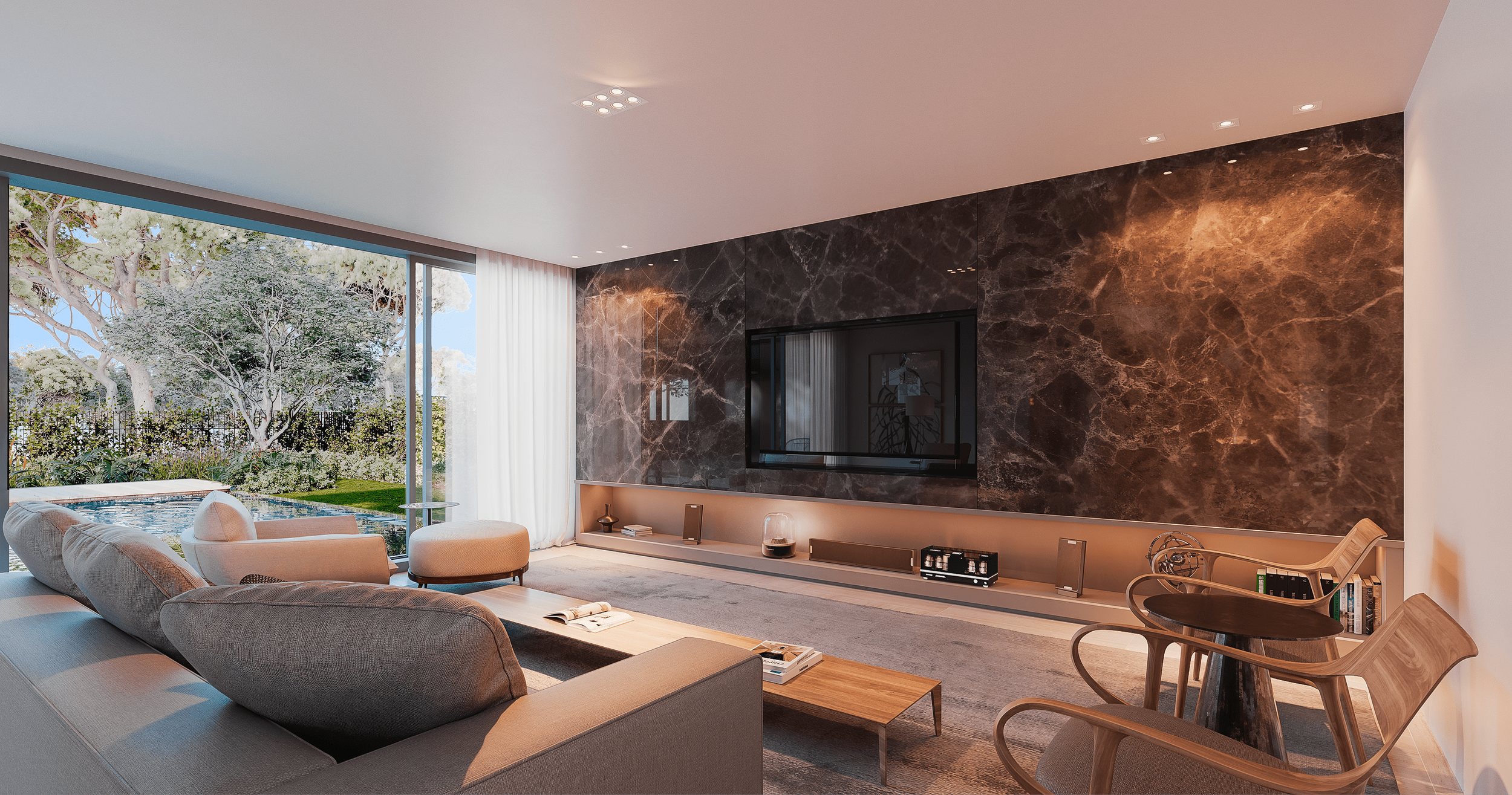 Com mais de 700 m² de área bruta privativa e jardins superiores a 400 m², cada residência é um refúgio de design contemporâneo, onde a arquitetura de assinatura valoriza a luz natural e a integração perfeita entre interior e exterior. As áreas sociais distinguem-se pelo pé-direito duplo, as cozinhas de autor totalmente equipadas com ilha, o elevador privativo, bem como espaços versáteis como spa, ginásio, escritório, home lounge e garagem para quatro viaturas com estação de carregamento elétrico.